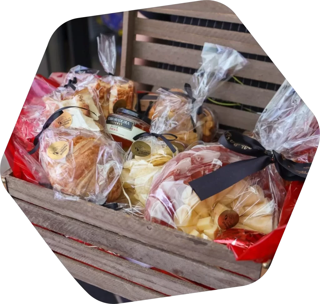 Bebidas (Vinho Tinto e Água c/ Gás), Pães e Salgados (Biscuit, Croissant Francês, Mini Empada, Mini Quiche, Pão Italiano, Pão Ciabata de Fermentação Natural, Semi Italiano e Torradinha de Alho), Patês (Salame com Damasco e Ervas Finas), Queijos, Frios e Frutas (Parmesão, Brie Folheado, Presunto Parma e Uva Thompson), Acompanhamentos (Azeitona Chilena, Batata Chips, Mix de Castanhas, Geleia de Pimenta, Mel e Caixinha de Camafeus).